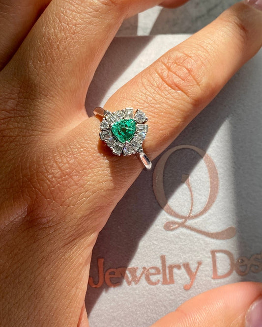 Anillo de Corazón en Oro Blanco 18k con Esmeralda y Diamantes